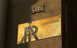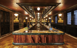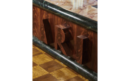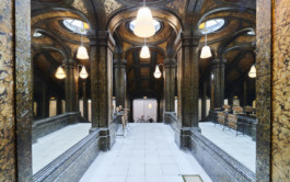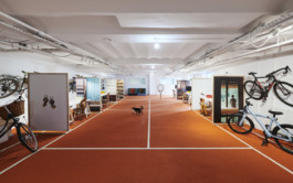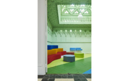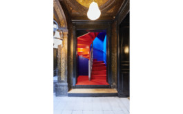 ARI transformed the former galleried ballroom into a workspace wonderland: over 600 sq m and two floors, ARI’s team works among Gothic-style statues, gilded panels, stained glass and expressive veneers. The original ballroom has become an open-space office, a rectangular shared desk enveloping a bespoke glass bookcase. A brightly hued staircase leads to the mezzanine: originally a resting and viewing spot for tired dancers, it is now part of the office, with USM furniture creating a delightful contrast with the original features.